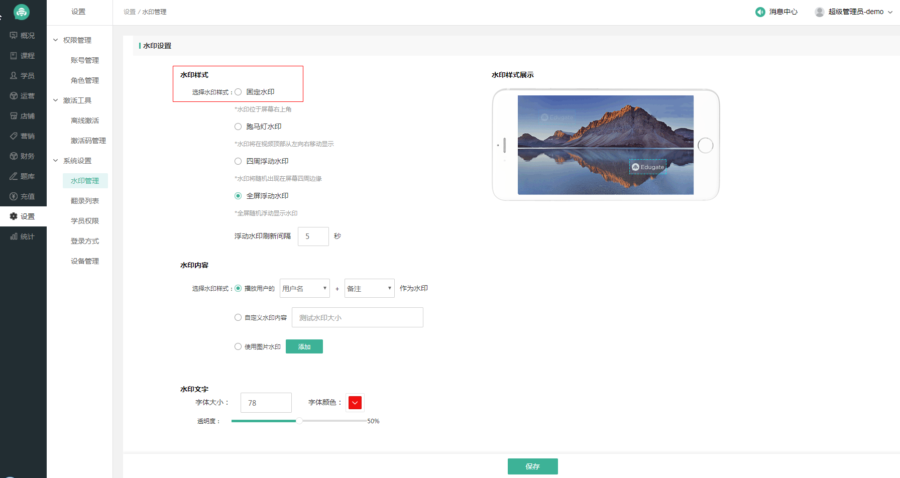 6、防翻錄水印文字樣式設置,可以對水印參數進行設置,水印大小、顏色和透明度等進行調整。到這來防翻錄水印設置完成,點擊“保存”即可。