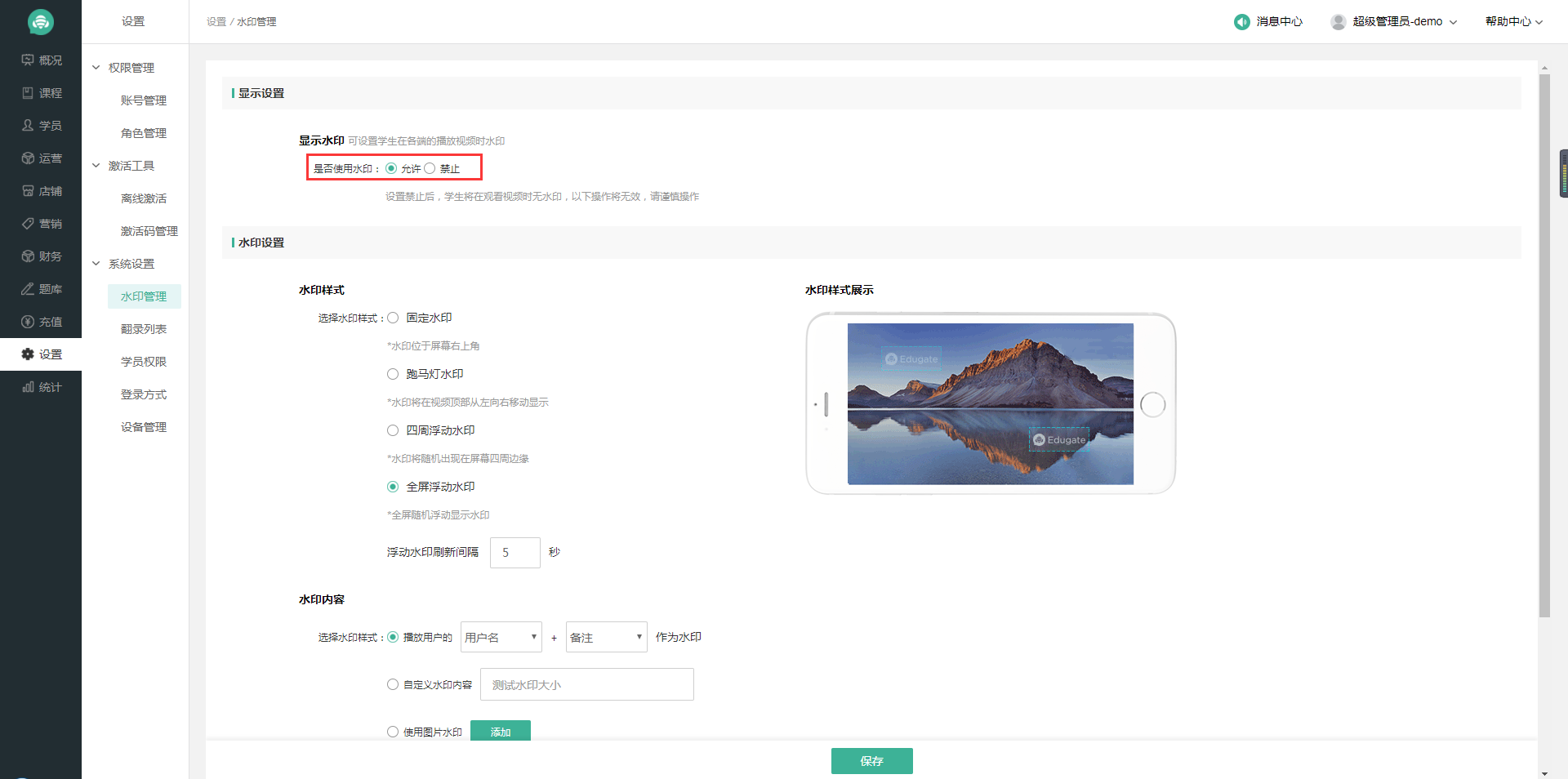 3、防翻錄水印顯示設置,一般防翻錄水印是默認允許使用水印的。防翻錄水印顯示在學生各端播放加密視頻時出現水印。如:電腦視頻加密播放器播放加密視頻時,屏幕出現水印;手機上大黃蜂App播放加密視頻時,顯示防翻錄水印。